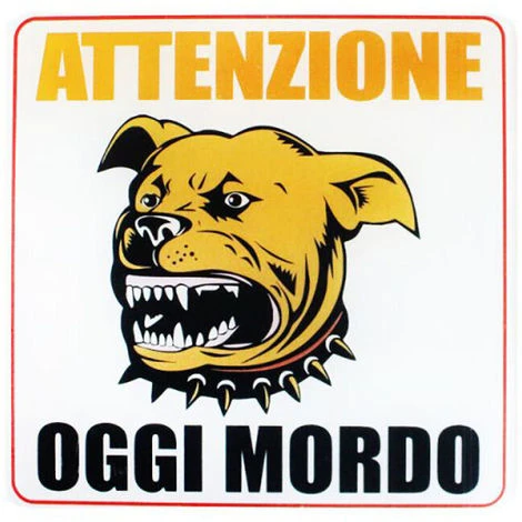 Realizzato in PVC, questo simpatico cartello rappresenta un feroce cane stilizzato in cartone animato.E’ spesso e resiste ad ogni tipo di intemperia.Per applicarlo sarà sufficiente rimuovere la pellicola che copre la parte biadesiva (realizzata dal leader mondiale di produttore di materiale adesivo, 3M) e applicarlo su una superficie liscia di qualsiasi materiale.Il potere adesivo è ultra potente, e la targa rimarrà fissa e stabile sulla superficie di applicazione.NB: le targhe sono protette anche frontalmente da una pellicola trasparente, per preservare la qualità della stampa e la vividezza dei colori.Rimuovere la pellicola trasparente frontale prima o dopo l’effettiva e definitiva applicazione.