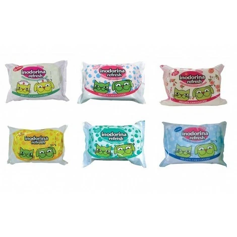 Le salviette Inodorina Refresh sono umidificate con una soluzione che, rispettando il PH naturale, deterge, deodora e lucida il manto del tuo animale d’affezione.
