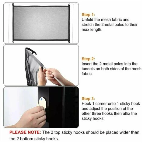 【Seconda installazione】Seconda installazione】Allunga 2 aste di metallo alla massima lunghezza, inserisci queste 2 aste nel tunnel su entrambi i lati e fissali, quindi attacca i 4 ganci adesivi dopo aver determinato la distanza, e infine appendi il tessuto su 4 ganci.