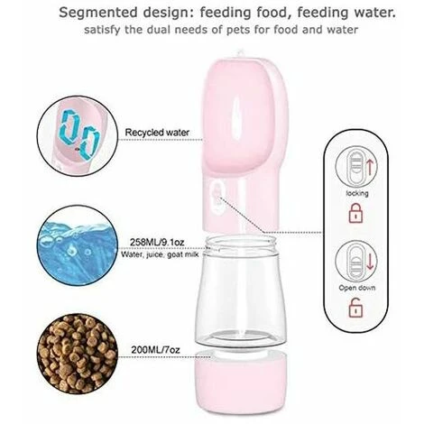 La borraccia per cani dal design a doppio strato contiene 258 ml di acqua e 200 ml di cibo. Puoi conservare l’acqua nella parte superiore e il cibo nella parte inferiore. Il contenitore per alimenti per cani con design a ombrello può mantenere il cibo fresco. Perfetto per le esigenze di cibo e acqua del tuo animale domestico con una ciotola. La guarnizione in gel di silice appositamente progettata e il pulsante di blocco assicurano che questa bottiglia d’acqua non perda affatto. Il design del dispenser consente di restituirlo inutilizzato. acqua alla bottiglia Non avrai più bisogno di una ciotola in più e non dovrai più preoccuparti di sprecare anche poche gocce d’acqua.