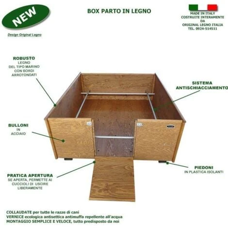 Il box parto è adatto anche a cani di notevoli dimensioni e poggia su resistenti piedoni di plastica che lo isolano dal pavimento.
