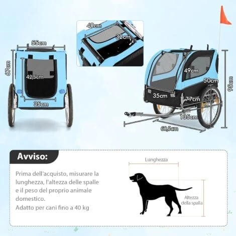 Viaggia con il tuo adorabile amichetto a quattro zampe! Il nostro rimorchio per bicicletta per animali carica fino a 40kg, ed è adatto per il trasporto di animali di piccole e medie dimensioni. Realizzato in resistente tessuto Oxford e con un robusto telaio in acciaio, il rimorchio vi durerà per moltissimi anni. Per garantire la sicurezza, il rimorchio è dotato di una bandiera segnaletica rossa e di 8 catarifrangenti per migliorare la visibilità, e di una copertura protettiva per proteggere il vostro amico peloso dalle intemperie. Grazie alle 2 porte, alla capote spalancata e alle 2 finestre a rete, il vostro animale domestico potrà godersi la brezza fresca e il bellissimo paesaggio quando viaggia per strada. Con questo rimorchio, il vostro cagnolino potrà godersi il viaggio insieme a voi. (Attenzione: Prima dell’acquisto, misurare la lunghezza, l’altezza delle spalle e il peso del proprio animale).