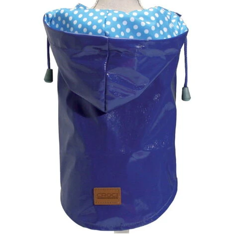Perfetto per l’autunno e le fredde giornate d’inverno. Massima vestibilità grazie all’elastico sottocoscia per zampe, foro per guinzaglio, cappuccio a pois.