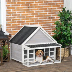 PawHut Cuccia Per Cani Da Esterno In Legno E PVC Con Portico E Finestre, 126x118x105cm, Grigio