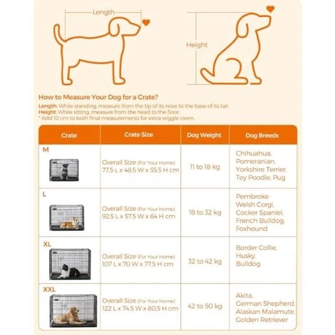 - Suggerimento per scegliere la gabbia giusta: lascia che il tuo cane stia in piedi e misuri la sua lunghezza dalla base della coda al naso; lascia che il tuo cane si alzi e misuri la sua altezza dalla sommità della testa al suolo, quindi aggiungi 10 cm a la lunghezza e l’altezza misurate per selezionare le dimensioni giuste per il tuo cane.