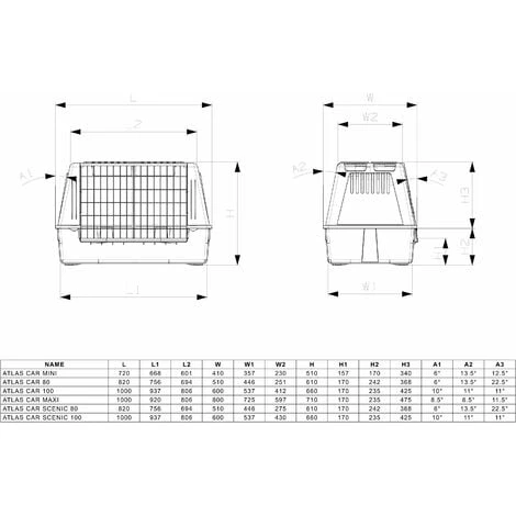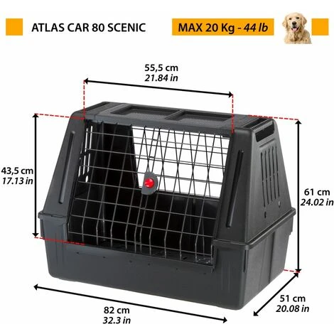 - Trasportino per cani, progettato per essere inserito nel bagagliaio della maggior parte delle auto; realizzato in resistente resina termoplastica
