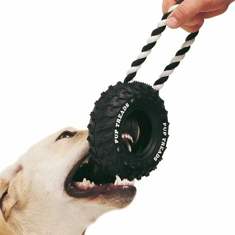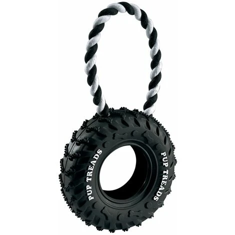 In questa simpatica versione, il gioco si compone di un cordoncino in cotone intrecciato a cui è attaccato uno pneumatico di gomma dura. Il cordoncino funge da manico e vi permetterà di tenere saldamente la presa mentre il cane tirerà con tutte le sue forze la ruota azzannata, assicurando perciò il massimo del divertimento a entrambi.