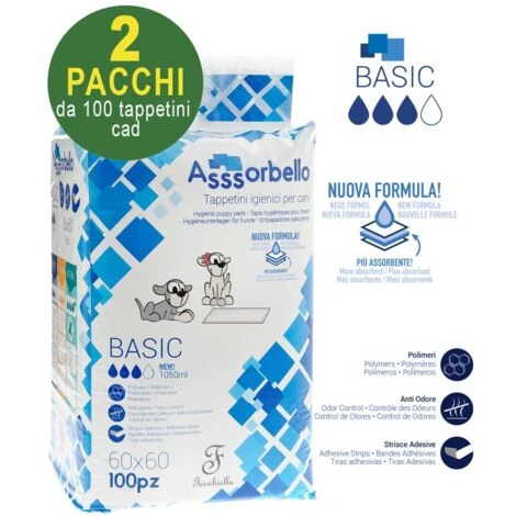200 Tappetini igienici Asssorbello Basic 60×60 cm per cani – 2 pacchi da 100 pezzi cad.