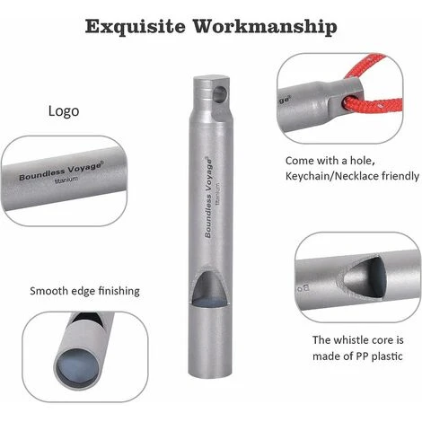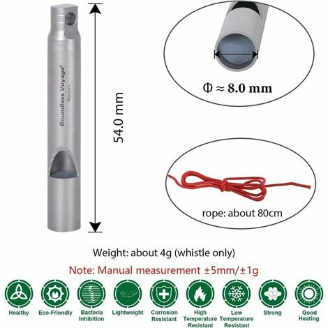 Materiali: 99,8% titanio, plastica PP (anima del tubo); Dimensioni: 8 mm * (L) 54 mm (fischietto), 80 cm (corda); Peso: circa 4 g (solo fischietto), 5 g (fischietto + corda). Realizzato in titanio di alta qualità, è leggero, non arrugginisce, resiste alla corrosione acida e alcalina, ai graffi e al calore. .