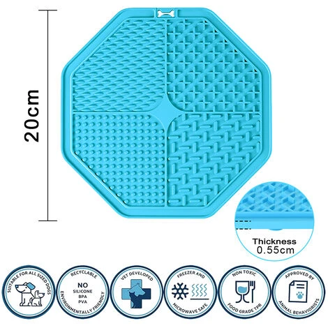 4.Riduce l’ansia, la noia e il comportamento distruttivo Aiuta a calmare e lenire il tuo animale domestico a rilasciare endorfine attraverso la promozione della leccatura. Questo tappetino per cani è un’alternativa sicura da leccare per il tuo cane. Ottimo per periodi stressanti come visite veterinarie, tempo del bagno, taglio delle unghie, recupero da lesioni, temporali e fuochi d’artificio