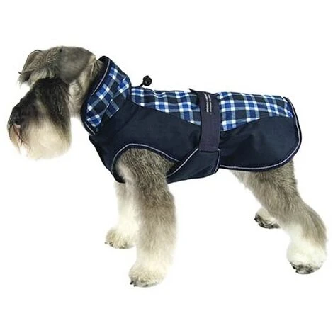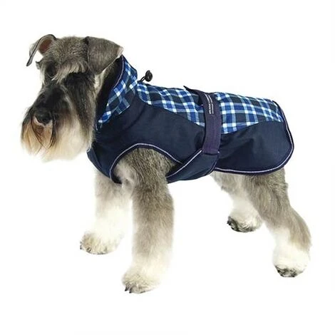 questo elegante cappotto a quadri bianchi e blu proteggerà perfettamente il tuo cane dal freddo, coprendo tutta la schiena, il collo e gran parte della pancia.L’interno è realizzato con una fodera