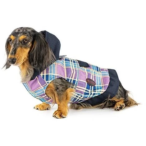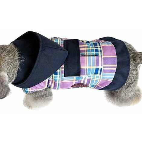 Con il suo divertente cappuccio, e il motivo a scacchi nei toni lavanda e blu, il vostro cane sarà il più allegro sotto la pioggia.