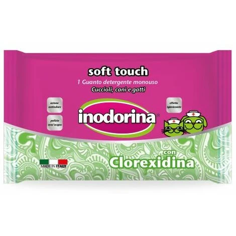 Il guanto detergente Inodorina Soft Touch è studiato per la cura e la pulizia di cani, gatti e cuccioli. Una pellicola interna al guanto isola la mano dalle impurità che vengono trattenute dal tessuto.