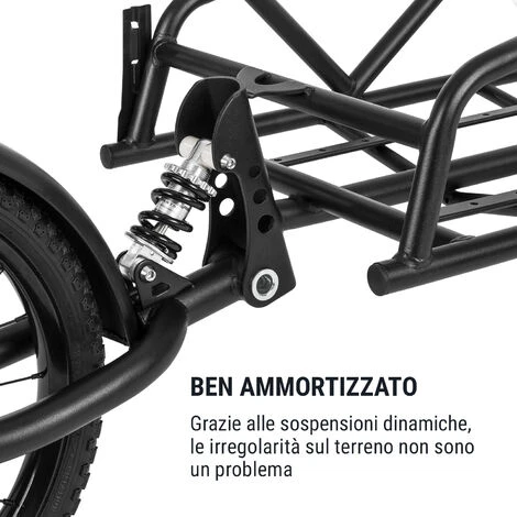 Nell’ampio vano di carico del rimorchio per bicicletta Follower di Klarfit trovano spazio sulla superficie da 35,5 x 65 cm bagagli, casse per bevande, sacchi di terriccio o tutta l’attrezzatura da campeggio. Con un peso di 11 kg il Follower risulta essere molto leggero. Il resistente telaio d’acciaio regge senza problemi fino a 35 kg. Il montaggio è veloce e semplice: il rimorchio viene fissato all’asse della ruota posteriore della bici con una chiusura di sicurezza. A garantire un comodo rollio ci pensano i pneumatici da 16″ con protezione antiforatura. Uno spesso strato di caucciù sulla superficie di corsa evita che schegge di vetro, viti o altri oggetti appuntiti si insinuino fino al tubo. Le asperità nel terreno e i tragitti offroad non sono più un problema per il Follower con il molleggio dinamico. Per la sicurezza stradale, la bici dispone di un riflettore sulla ruota e sul parafango. Inoltre una bandiera di sicurezza garantisce maggior visibilità nel traffico.