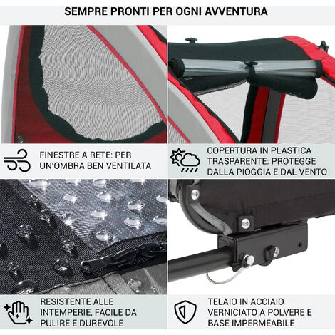 Grazie al design SmartSpace Concept, l’ampio vano con un volume di circa 250 litri e una capacità di carico di 45 kg offre spazio sufficiente per trasportare comodamente cani di taglia piccola e media. Realizzato con un telaio di acciaio verniciato a polvere e rivestito con tela Oxford 600D particolarmente resistente, il tuo compagno a quattro zampe è sempre protetto al meglio. Il prodotto è appositamente rinforzato per il trasporto di cani e dotato di un fondo in plastica antiscivolo, idrorepellente e facile da pulire e di ruote da 16″ per una fantastica esperienza MaxComfort Riding. Un’imbracatura preinstallata all’interno assicura la massima sicurezza durante gli spostamenti. Gli sportelli a rete apribili davanti e dietro permettono un facile accesso al cane e garantiscono il flusso di aria fresca. In caso di maltempo o di vento forte, è possibile chiudere completamente le aperture sui lati anteriore e posteriore con dei teli trasparenti aggiuntivi.