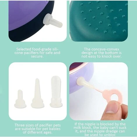 Design scientifico: L’alimentatore è a forma di petto, con una capacità di 180 ml. I ciucci di diverse dimensioni sono adatti a cuccioli di animali domestici di diverse età e il coperchio può aiutare a ridurre la pressione dell’aria e impedire la fuoriuscita del latte.