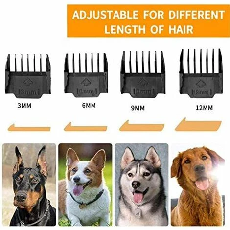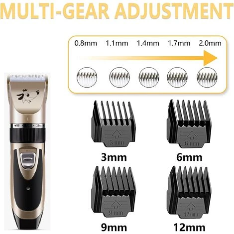 - 【Posizioni regolabili】 Tosatrice per animali Con la sua rotella di regolazione fine, ha 5 altezze regolabili (0,8 mm-2,0 mm) ed è dotato di 4 pettini guida (3 mm/6 mm/9 mm/12 mm) di diverse lunghezze. Adatto per animali domestici con diversi tipi di pelo.