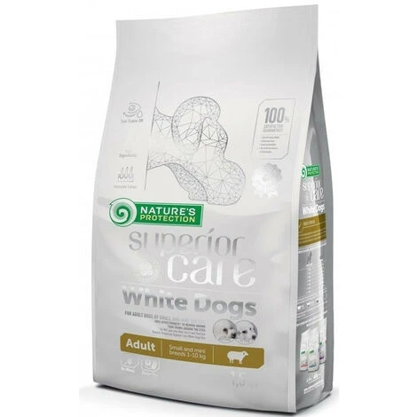 Nature’s Protection Superior Care White Dogs è il primo alimento completo super premium per cuccioli di taglia piccola e mini, studiato appositamente per la bellezza del manto bianco dell’animale. Grazie alla sua speciale formulazione priva di grano, aiuta ad evitare disordini del sistema digestivo ed allergie; inoltre garantisce il 100%* di efficacia nella rimozione delle macchie da contorno occhi, muso e zampe.