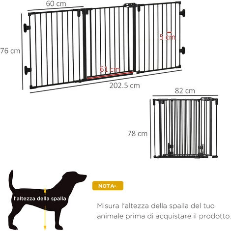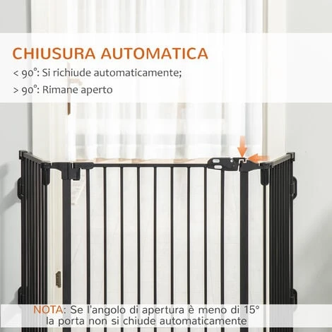 Il cancelletto per cani PawHut è la struttura perfetta per tenere i tuoi animali al sicuro. Usalo come cancellino di sicurezza per le scale o come barriera per zone della casa in cui i tuoi pet non possono entrare. La barriera di sicurezza è pieghevole, così quando non ti serve la potrai riporre con il minimo ingombro. È presente una porta per un accesso facilitato, che è dotata di un pratico sistema di chiusura automatico.
