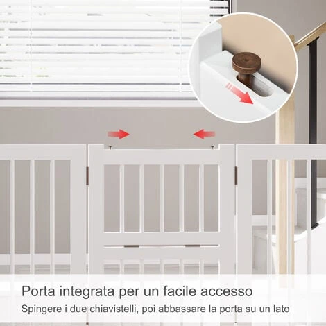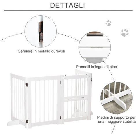 Questo cancellino per cani PawHut ti aiuta a creare uno spazio sicuro per il tuo animale domestico. Il recinto è realizzato con 4 pannelli in legno collegati tra loro da giunture in metallo, per garantirti la massima durata nel tempo. Ha una comoda porta che puoi aprire e richiudere, così da spostarti da una stanza all’altra della casa senza dover rimuovere il cancelletto. E, quando non ne hai più bisogno, puoi piegarlo e riporlo comodamente senza occupare troppo spazio.