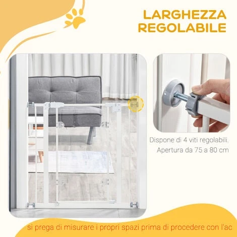 Il cancellino di sicurezza PawHut è ideale per tenere i tuoi cani lontani dalle scale o dalle stanze in cui non vuoi farli entrare. La struttura è realizzata con materiali sicuri, atossici e resistenti. Il cancellino per cani si adatta alla larghezza dei tuoi spazi grazie alle viti regolabili. Il sistema di chiusura automatico tiene al sicuro i tuoi amici a quattro zampe quando ti dimentichi il cancello aperto. Rendi la tua casa più sicura per i tuoi cani con questo cancellino!