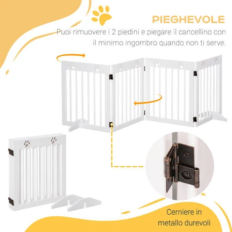 Con il cancellino per cani PawHut i tuoi amici a 4 zampe saranno sempre al sicuro negli spazi dedicati a loro. È composto da 4 pannelli collegati con robuste cerniere doppie. Puoi dargli la forma che preferisci per adattarlo ai tuoi spazi e, quando non ne hai bisogno, lo riponi con il minimo ingombro. Il cancelletto di sicurezza è perfetto da usare davanti alle scale o alle porte. Rendi la tua casa più sicura per i tuoi piccoli amici!