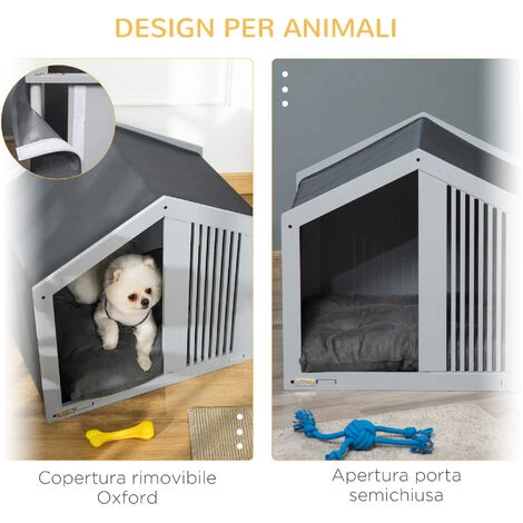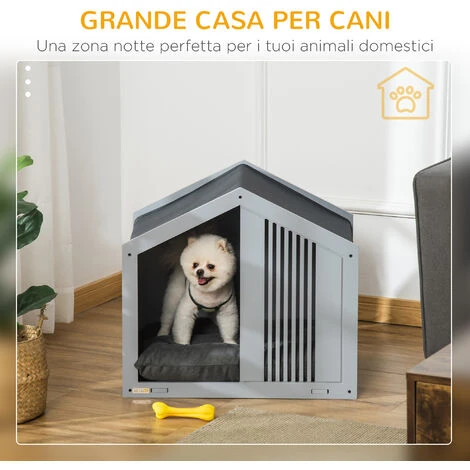 La cuccia per cani a casetta PawHut diventerà il posto preferito dei tuoi amici a 4 zampe per riposare e rilassarsi. Costruita con pannelli truciolari, è robusta e resistente, ideale per cani di taglia media e piccola fino a 12 kg. Il tetto è dotato di una copertura in tessuto, per favorire il ricircolo dell’aria, e la parte interna include un comodo cuscino su cui rilassarsi.