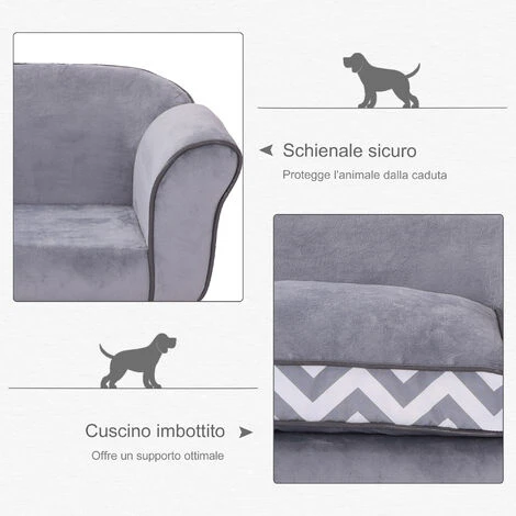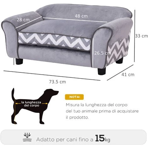 Questo divano per animali domestici PawHut può creare un confortevole posto per i vostri piccoli amici a quattro zampe. La robusta struttura in legno massello è in grado di supportare un carico massimo di 15kg. Il divano ha un cuscino morbido imbottito con spugna ad alta densità che lo rende molto comodo. Il cucino può inoltre essere rimosso e lavato a parte.