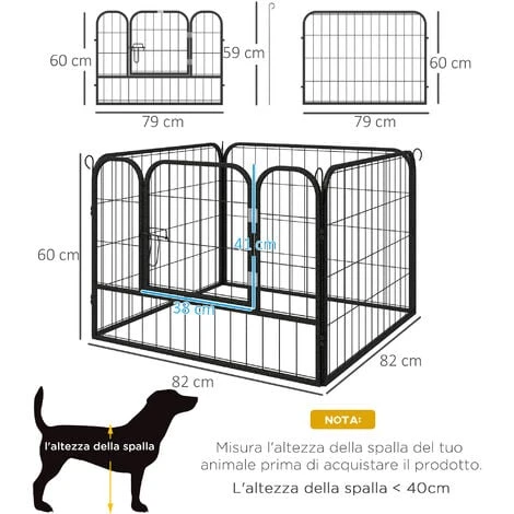 Realizzato con tubi e fili metallici di alta qualità, questo box per cani PawHut è perfetto per tenere al sicuro i tuoi animali. È dotato di 4 picchetti per fissarlo a terra in modo stabile. Grazie al design pieghevole lo trasporti facilmente e lo riponi con il minimo ingombro quando non ti serve. Il recinto per cani ha una porta per facilitare l’ingresso, dotata di un catenaccio per evitare l’apertura accidentale. Usalo in casa o all’aperto per offrire uno spazio sicuro ai tuoi animali.