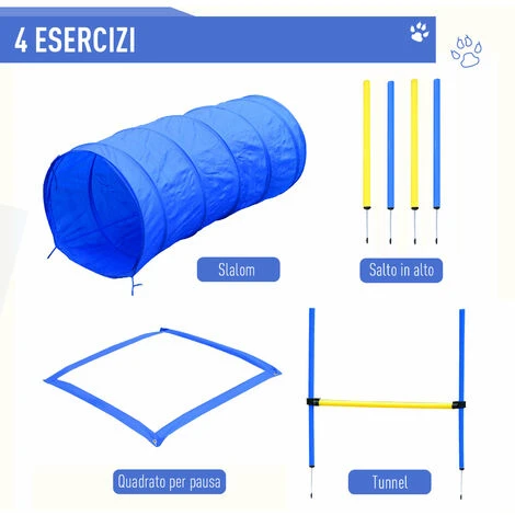 Hai un cane pieno di energia a cui piace essere messo alla prova? Il percorso agility dog PawHut è quello ti serve! Il percorso agility dog per addestramento cani è composto da un tunnel, slalom e un ostacolo regolabile in altezza. Questo set agility con giochi per cani è facile da portare in giro grazie alle sacche di trasporto incluse e alla sua leggerezza. Divertiti con il tuo cane e rafforza il vostro legame mentre vi allenate insieme!