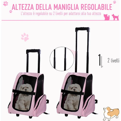 Lo zaino trasportino PawHut è l’accessorio immancabile per chi ama muoversi insieme ai propri amici a 4 zampe. Realizzato con una struttura robusta e tessuto Oxford resistente, può essere usato sia come zaino per gatti e cani sia come trasportino trolley. Le ruote e la pratica maniglia estraibile rendono più facile trasportare i tuoi animali per farli viaggiare comodi e sicuri.