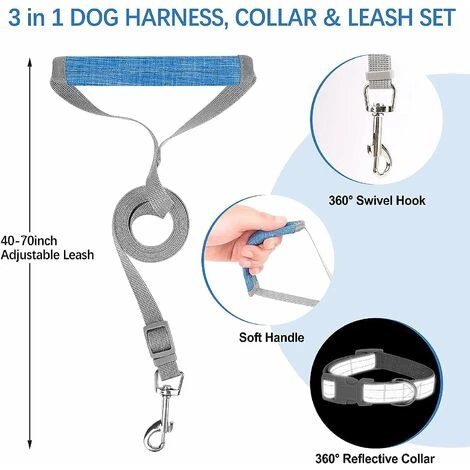 SET 3 IN 1 – Questo set di pettorine, collare e guinzaglio per cani di piccola taglia ha tutto ciò di cui hai bisogno, quindi non è necessario acquistare altri collari e guinzagli per animali domestici. Il cinturino è regolabile di 40-70 pollici (circa 101,6-177,8 cm) e il manico è comodo e morbido. Il colletto è inoltre dotato di un anello a D per la regolazione.