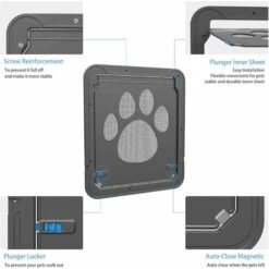 Installazione semplice, adatta per legno, PVC, UPVC, pareti e porte in vetro. Patta impermeabile trasparente con chiusura muta. Telaio in plastica resistente con blocco manuale a quattro vie.