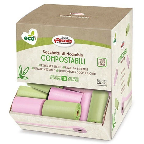 Sacchetti di ricambio compostabili Super resistenti, ultra spessi per trattenere odori e liquidi Origine vegetale: a base di amido di mais OGM-FREE Facili da separare e da aprire Misura extra large Co …