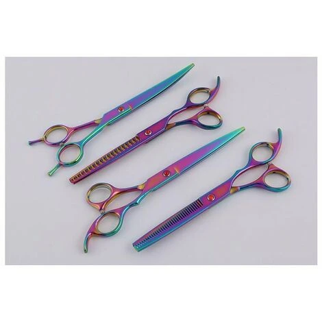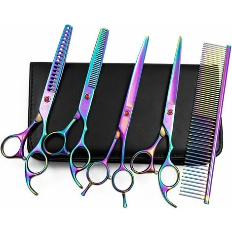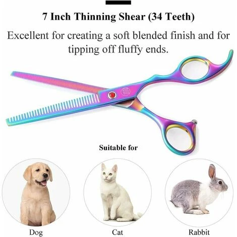 SET COLORATO: Il set di forbici per toelettatura cani comprende una forbice dritta da 7 pollici, una forbice curva da 7 pollici, un pettine per animali domestici e due forbici seghettate: una con 34 denti e l’altra con 19 denti. Le forbici per sfoltire sono molto utili per tagliare i peli intorno al naso, alle orecchie e alle gambe e le loro piccole lame indipendenti rendono facile e sicuro tagliare i peli.