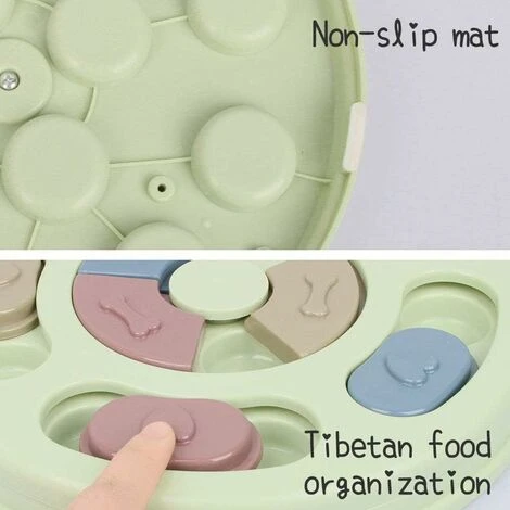 Design del tappetino antiscivolo: ci sono tappetini antiscivolo sul fondo del giocattolo educativo per cani per evitare che il contenitore del cibo si muova mentre si mangia o si gioca. Con un cursore in plastica non rimovibile.