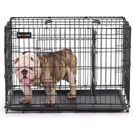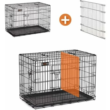 Facile da Piegare e DispiegareGrazie al design intelligente, puoi montare questa gabbia per cani in pochi passi, senza attrezzi! Piega la gabbia per risparmiare spazio durante lo stoccaggio o il trasporto. | Parete Divisoria MultifunzionaleCon la partizione regolabile, puoi regolare lo spazio nella gabbia in base alle esigenze del tuo cane. Il tuo animale domestico può dormire in un lato e mangiare o essere addestrato nell’altro. Più grande diventa il tuo cane, più puoi spostare la parete divisoria per dare più spazio al tuo animale domestico. | Facile da Spostare senza Graffi sul PavimentoLa parte inferiore della gabbia è dotata di 8 piedini in plastica che facilitano lo spostamento della gabbia senza graffiare il pavimento. | 2 Porte e 4 Chiavistelli a LLe porte anteriore e laterale consentono un facile accesso al cane e una facile pulizia della gabbia. I chiavistelli a forma di L bloccano saldamente. |