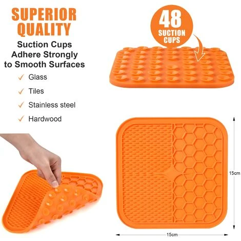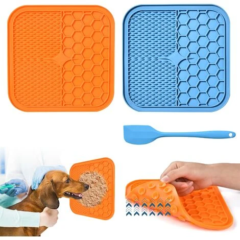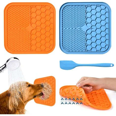 Pratico set di tappetini per leccare il cane: 1 tappetino per leccare il cane blu + 1 tappetino per leccare il gatto arancione + 1 spatola in silicone blu. Il cane è dotato di 48 potenti ventose da attaccare a superfici lisce e pulite come vasche, banconi, vetro, perfetto per cani e gatti di tutte le taglie.