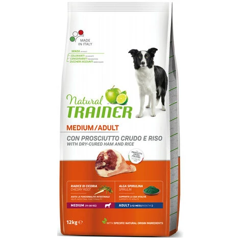 Trainer Natural Adult Medium con Prosciutto Crudo, Riso, Cicoria e Alga Spirulina è un alimento secco completo per cani adulti a partire da un anno di età e di taglia media (fino a 30 kg di peso).