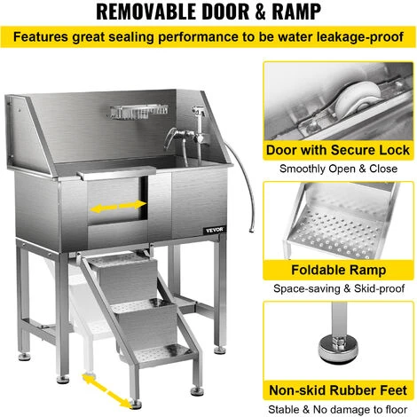 - Porta e Rampa Mobili: La stazione di lavaggio per cani monopezzo completamente saldata offre prestazioni di tenuta eccezionali per essere a prova di perdite d’acqua. La vasca è dotata di una porta scorrevole sinistra per tenere il tuo animale domestico all’interno della vasca; una rampa salvaspazio può essere piegata e nascosta quando non in uso, la superficie scanalata antiscivolo sulla rampa aiuta il tuo animale a entrare o uscire in sicurezza. Anche i piedini in gomma sono antiscivolo e non danneggiano il pavimento.