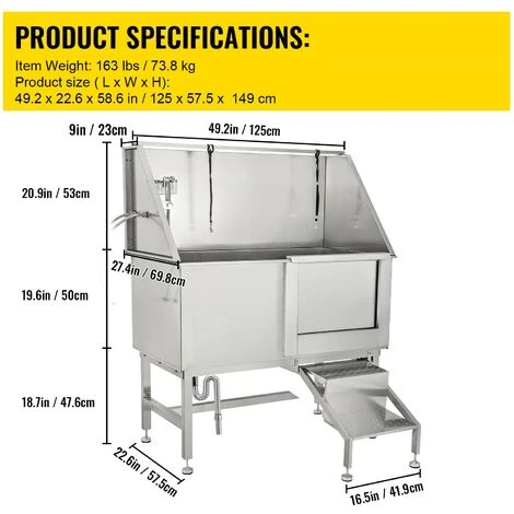- Vasca in Acciaio Inossidabile da 59″H: Dimensioni del prodotto: 49,2″L x 25,2″W x 59,5″H; Adatta per animali di taglia massima: 49″L x 25″W x 40″H. Può ospitare cani di diverse dimensioni (max.220LBS). La vasca da bagno per animali domestici è costruita con acciaio inossidabile 304, che non si deforma, arrugginisce, resistente, antigraffio e abbastanza robusto per un uso prolungato.Inoltre, la resistente vasca da bagno per animali domestici in acciaio inossidabile è di facile manutenzione e pulizia.