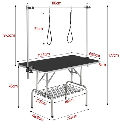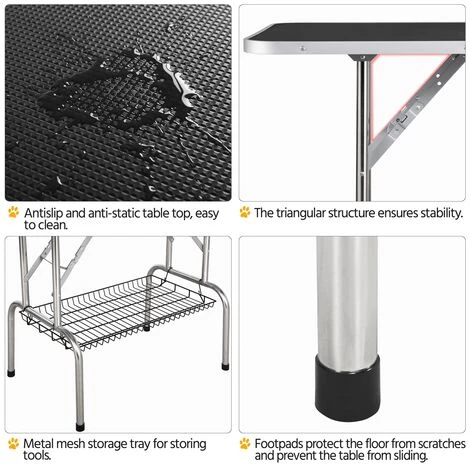 ✔️ Pratico: ci sono 4 sostegni in metallo per sostenere saldamente il piano e le gambe del tavolo. Il collegamento presenta una forma triangolare per offrire maggiore stabilità. L’altezza del telaio è regolabile, inoltre due corde aggiuntive servono tenere fermo il vostro animale domestico durante il bagno e la pulizia.