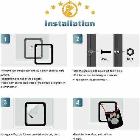 Installazione semplice: disponibile con cancello o finestra del cancello; Installa la zanzariera per animali domestici in un luogo adatto in base alle dimensioni del tuo cane e fissala con le viti. Le istruzioni sono incluse nella confezione del prodotto.